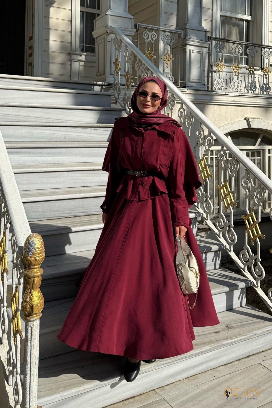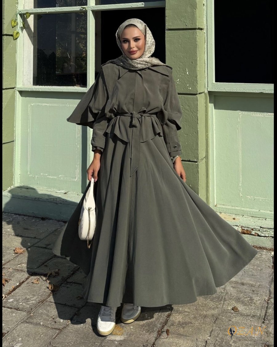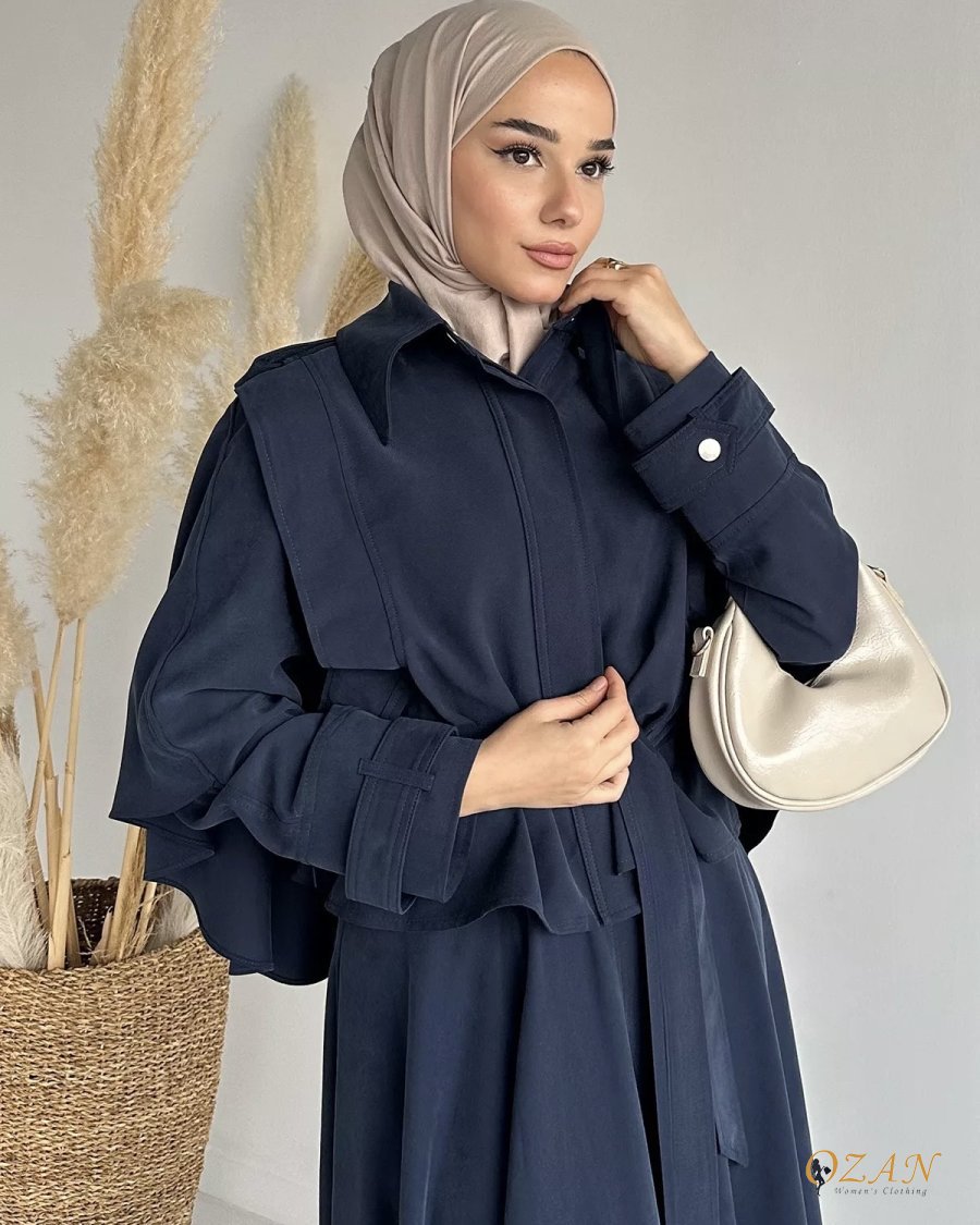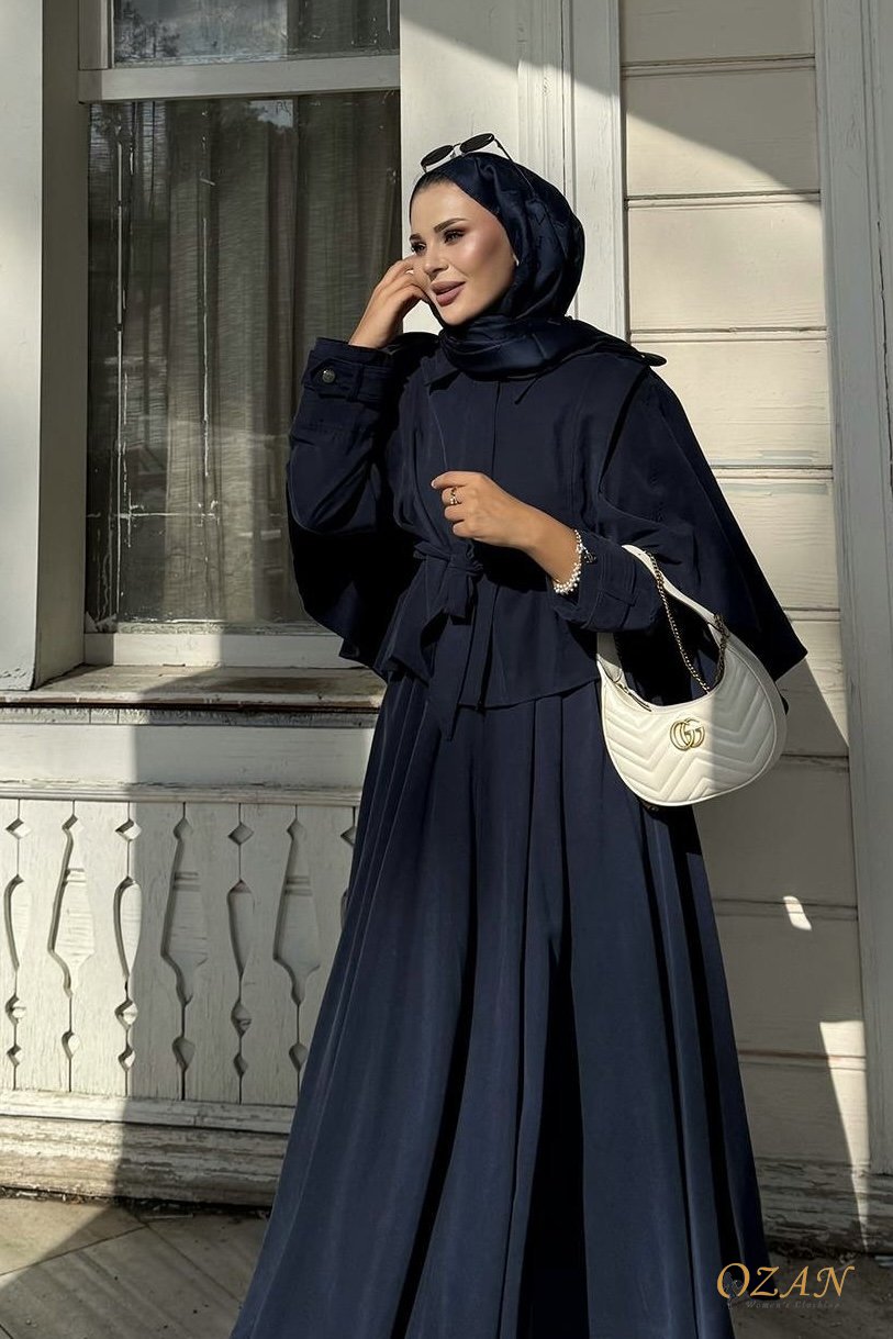 قطعتين و ربطة ع الخصر ، التنورة طولها كامل وافي ، الجاكيت من قدام اله زرار كبسات ، مع حزام ع الاكمام و الاكتاف