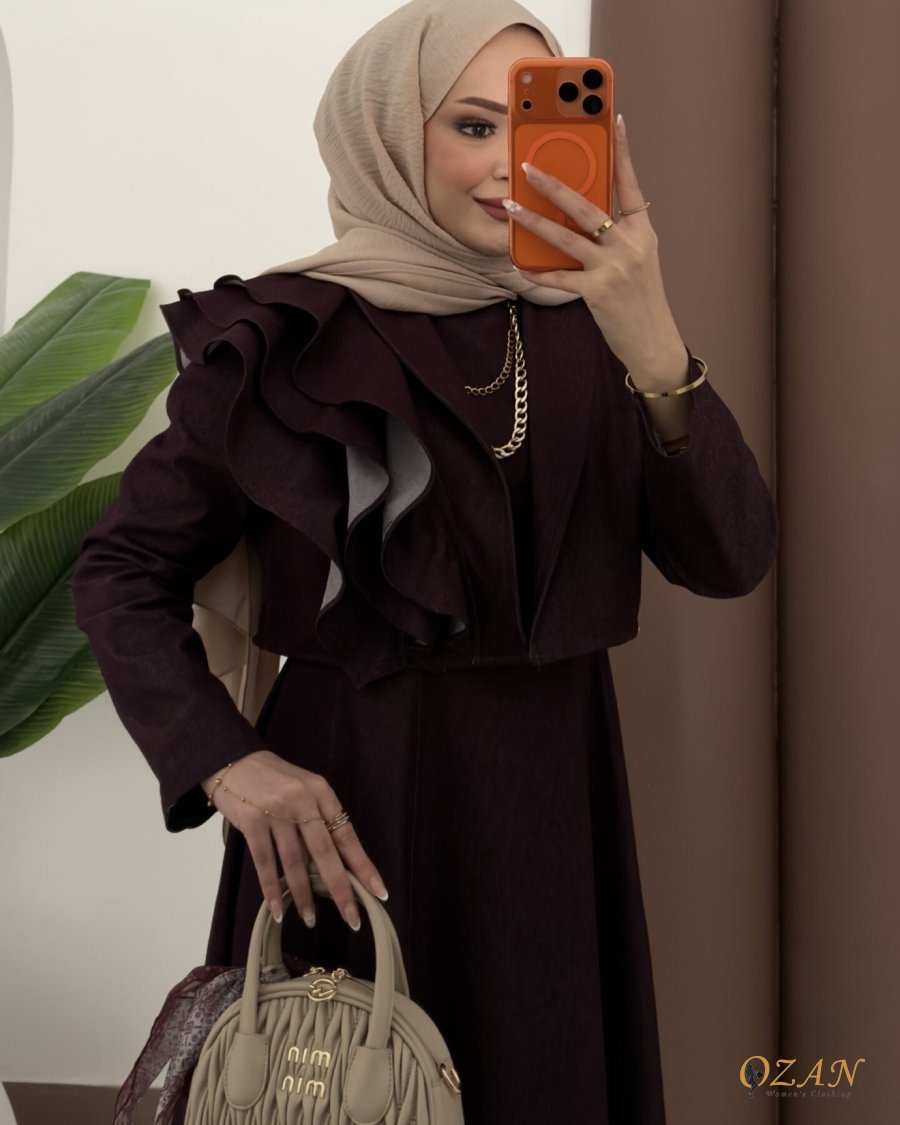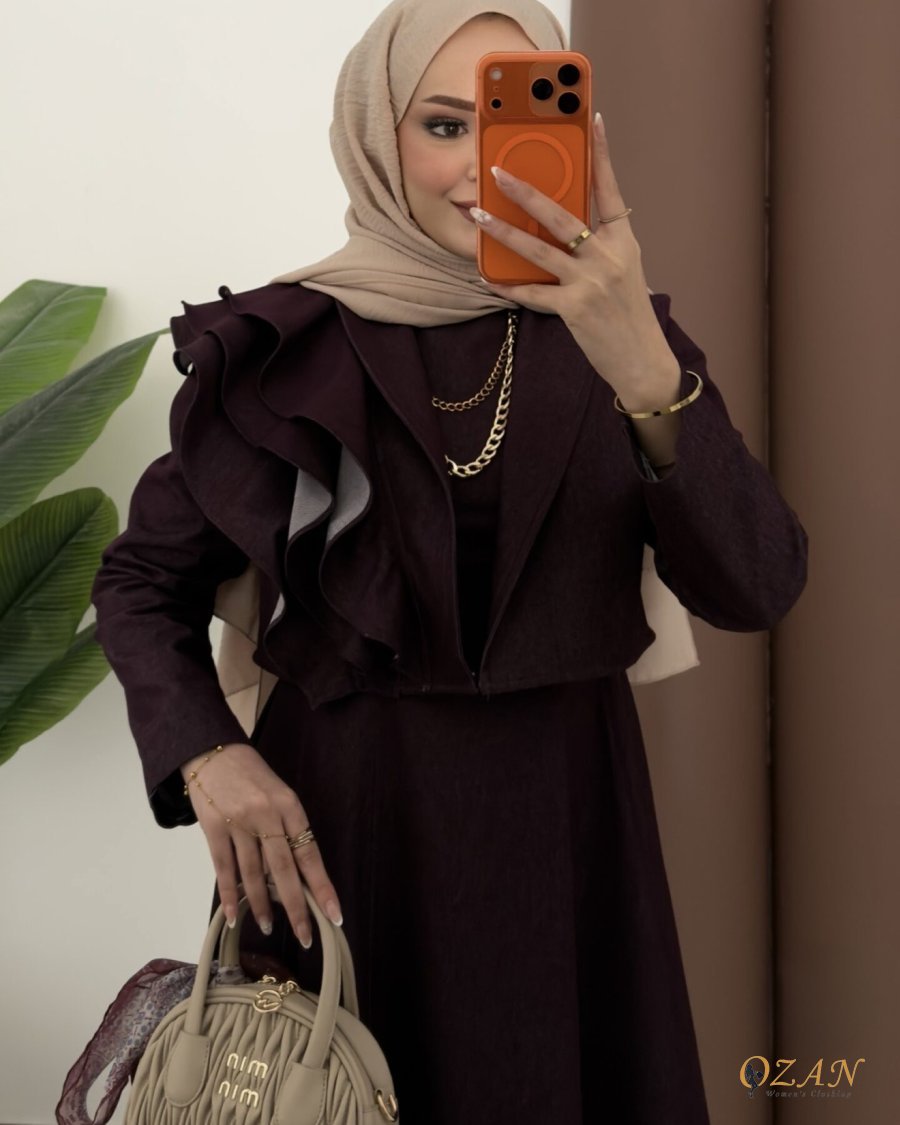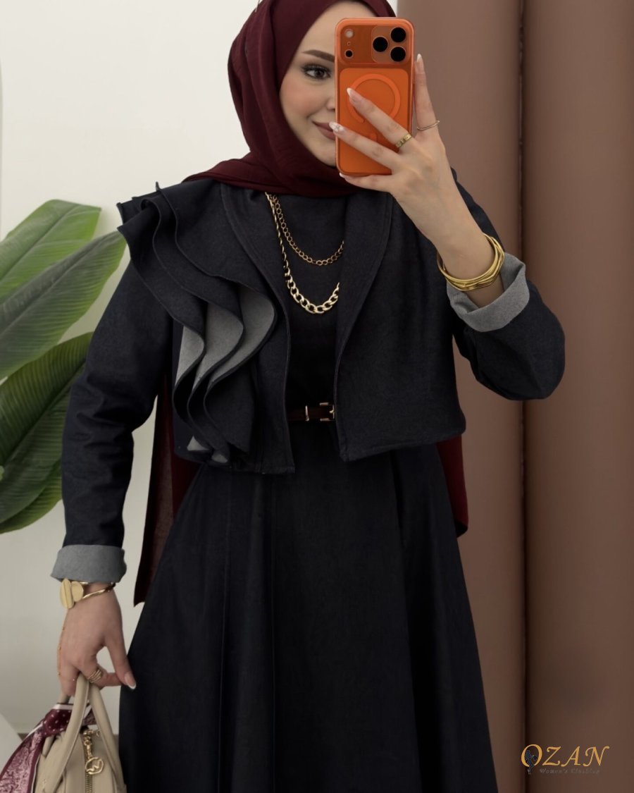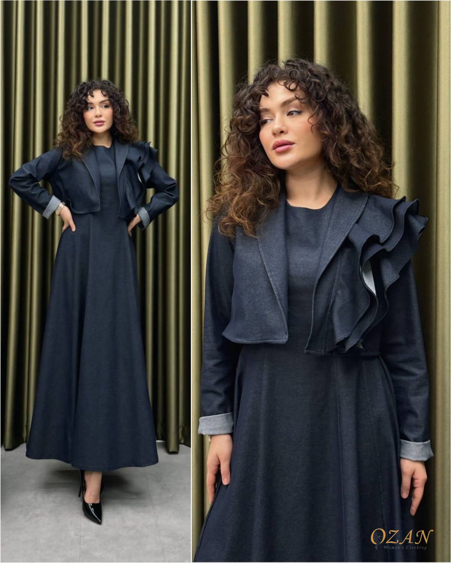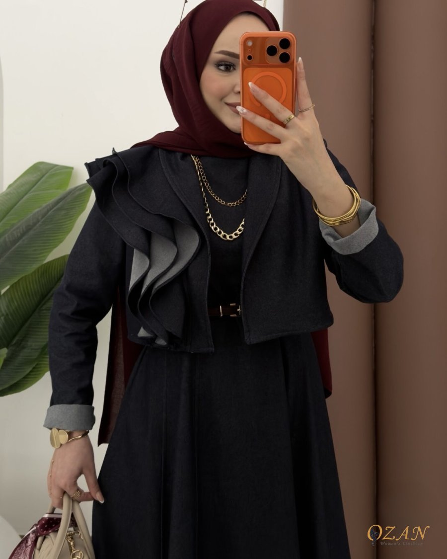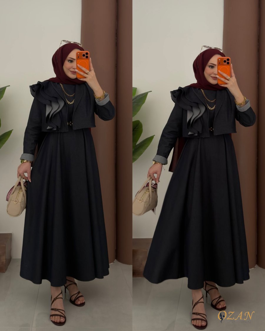 جينز ناعم ومريح ، مكون من قطعتين : فستان جيليه ( مشلح ) + جاكيت مرفرف كُم